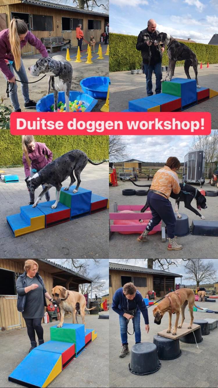 Vanmiddag stond er een bijzondere workshop op het programma: een workshop speciaal en alleen voor Duitse Doggen! Het idee kwam na het deelnemen aan een wandeling voor Duitse Doggen. Dat was zo leuk om met zoveel doggen samen te zijn. Nu kon ik ook een wandeling organiseren maar het idee ontstond om een workshop Fun, balans & coördinatie te organiseren. Datum geprikt en binnen no time zat de eerste groep vol en stond er ook een tweede groep op de planning.