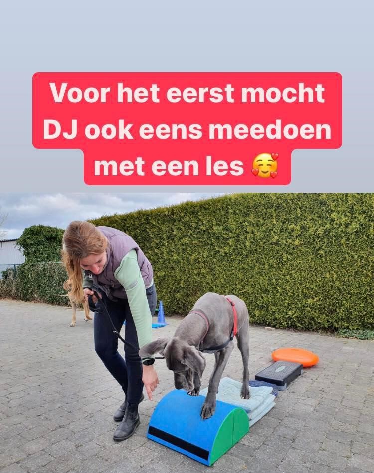 Vanmorgen zette ik alles klaar en hield er natuurlijk rekening mee dat deze doggen dit soort oefeningen nog nooit of niet vaak hebben gedaan. Het mocht best een uitdaging zijn maar opzetten voor succes was het idee. En het leukste, DJ kon nu ook eens meedoen met deze 'les'. Het was een gratis workshop dus de druk om iedereen iets mee te geven als in een gewone les was er niet. Natuurlijk gaf ik hier en daar aanwijzingen. Iedereen ging onder de stralen van een heerlijk zonnetje aan de slag en het begon hier en daar wat onwennig maar de doggen werden handiger en dapperder en de baasjes ging steeds beter begeleiden. Ook de tweede groep werkte heel leuk met hun doggies. Naarmate de les vorderde zag je de honden moe worden dus ze hebben vast heel goed geslapen toen ze thuis kwamen: Enkele doggen en hun baasjes moesten een uur of zelfs langer rijden om bij mij te komen. Heel erg tof dat zij dit er voor over hadden!