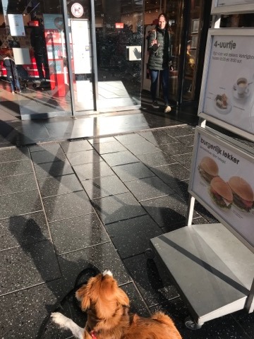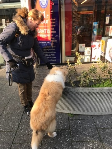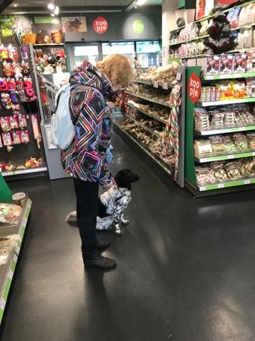 We hebben op verschillende objecten 'pootjes op' geoefend, we zijn een dierenwinkel in gegaan waar de honden natuurlijk niets uit de lekker ruikende schappen mochten pakken, we hebben ontmoetingen geoefend, met aandacht volgen en bij de Hema hebben we af en blijf geoefend waarbij de baasjes de winkel ook in moesten lopen en de honden moesten bij de ingang netjes blijven liggen. De honden én baasjes vonden het best wel spannend. Alle honden uiten zich net een beetje anders, de ene hond trilt en geeuwt, de andere hond krijgt ineens een lagere houding en nog een andere hond wordt heel druk. Toch slaagden alle baasjes erin hun hond netjes door deze training heen te loodsen met behulp van de clicker.