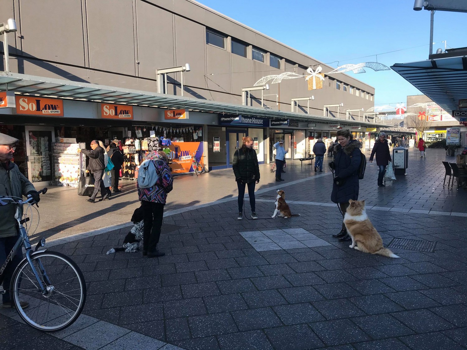 Vandaag stond een speciale les op het programma. De cursisten van de Jonge Honden Klas van de Martin Gaus school in Son/Eindhoven, kregen vandaag met hun honden les in winkelcentrum Woensel. Voor honden een vaak indrukwekkende plek: veel mensen, veel nieuwe geluiden en die geluiden klinken door de overkapping ook nog eens veel harder voor honden dan voor mensen. Niets werkt beter om dan in een moeilijke, nieuwe omgeving oefeningen te doen die hond en baasje kennen. Dat geeft rust en vetrouwen en de aandacht komt dan weer terug naar de baasjes in plaats van naar alles rondom de honden. Het leuke van een winkelcentrumles is dat het winkelend publiek altijd even komt kijken, zelfs winkeliers komen soms hun winkel uit om naar de knappe viervoeters te kijken.