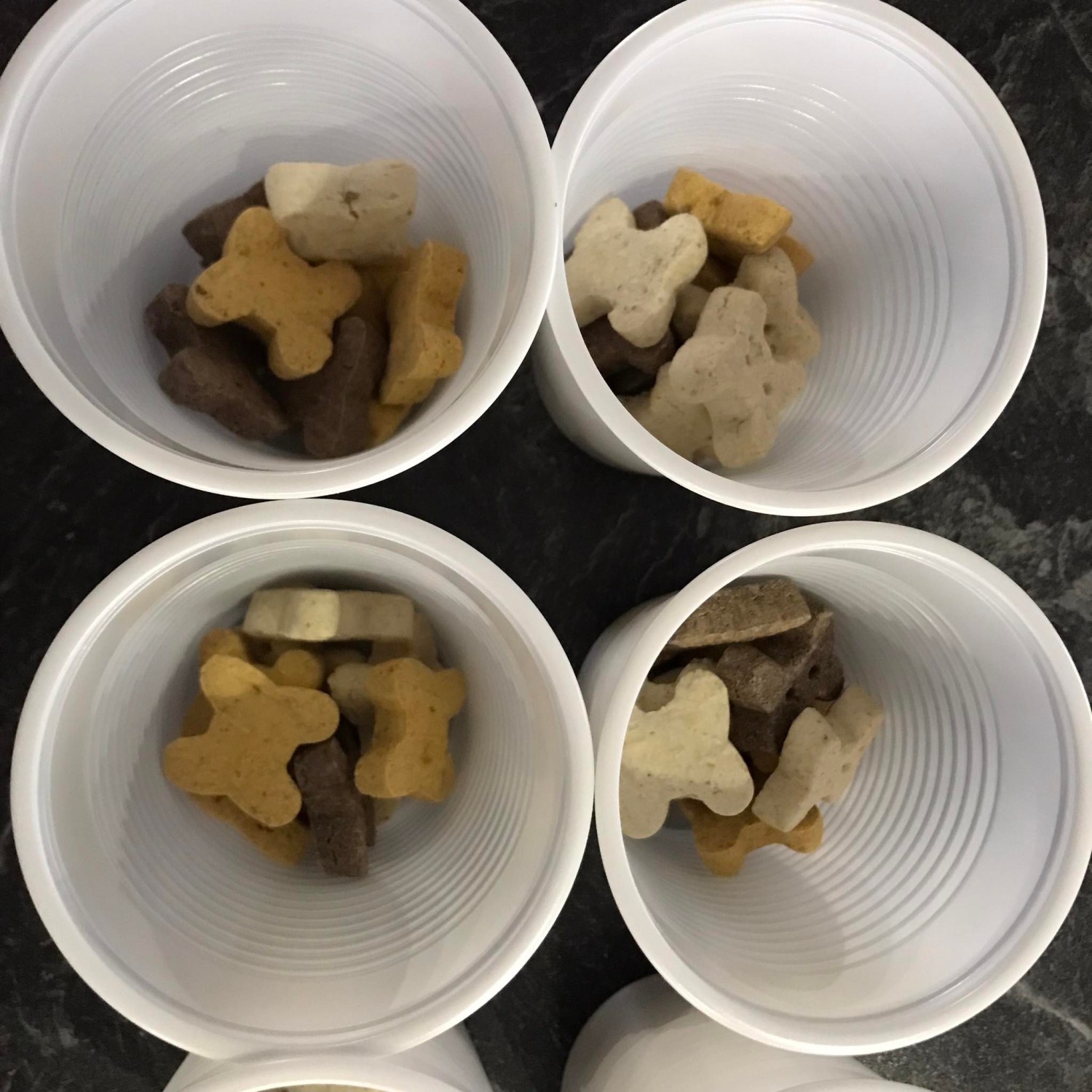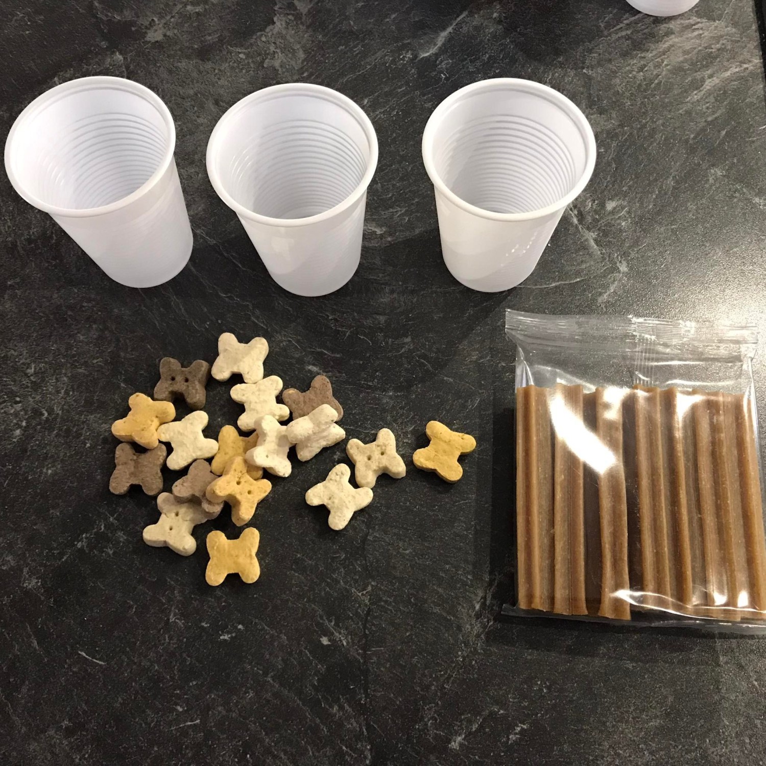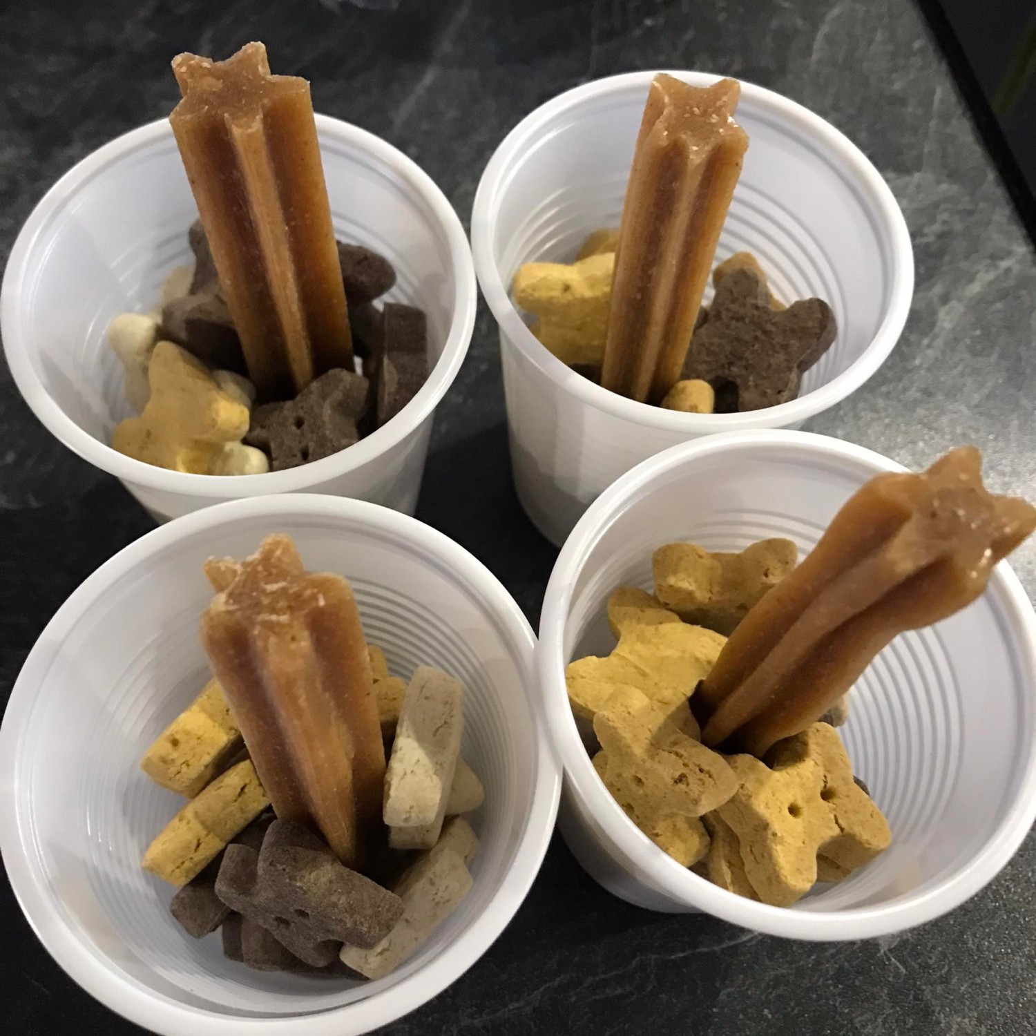 Vul de bekertjes met een klein laagje hondensnoepjes. Plaats een dentastick in het midden en vul aan met snoepjes rondom de dentastick zodat deze in het midden blijft staan.