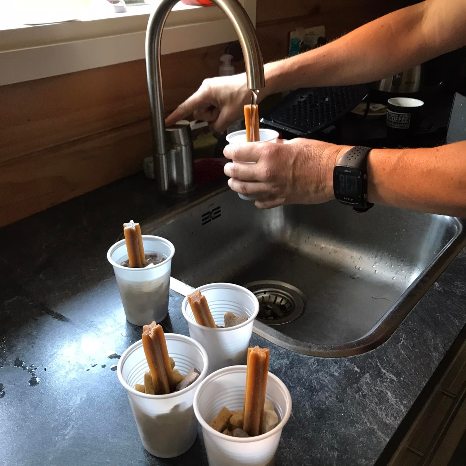 Vul het plastic bekertje met water zodanig dat alle snoepjes onder water staan en plaats de bekertjes in de vriezer. Paar uurtjes wachten en de ijsjes zijn klaar. Het plastic bekertje uiteraard verwijderen als je het ijsje aan de hond geeft en het ijsje even afspoelen onder de kraan dan kan het niet aan de tond vast plakken. Geef het ijsje op een plek die nat mag worden want uiteraard smelt het water als uw hond aan het ijsje begint.