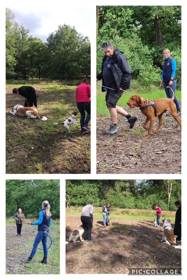 We oefenden 'ontmoetingen' tijdens de wandeling en we oefenden veelvuldig met het passeren van andere honden. Ook de baasjes kregen soms een moeilijke opdracht: niets tegen je hond zeggen behalve 'goed zo'. Op deze manier ga je meer nadenken over je eigen lichaamstaal en dat is veel duidelijker voor honden dan onze 'hele verhalen' die we meestal op de verkeerde momenten houden te onze hond.