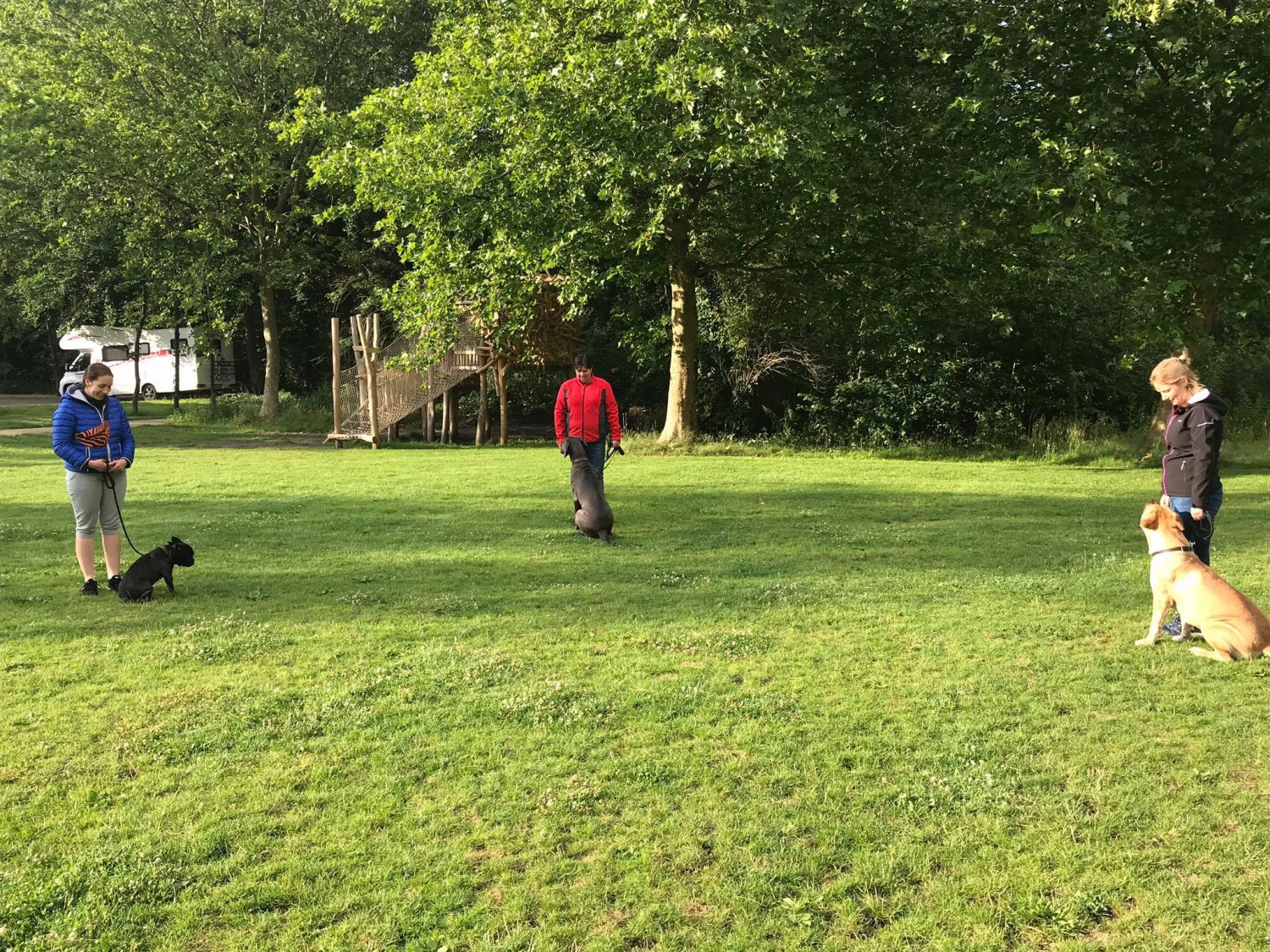 De les begon met aandacht vragen van je hond en die aandacht werd dan weer met aandacht vóór de hond beloond. Dat 'incheck-moment' is zo belangrijk dat je dat kan krijgen op eender welk moment. We oefenden alsof we naar het gemeentehuis moesten: trappetje op, eventuele andere mensen passeren en weer het trappetje af. Daarna oefenden we dat de honden rustig bleven als we zelf even op een bankje gaan zitten terwijl er andere mensen en honden langs kwamen.