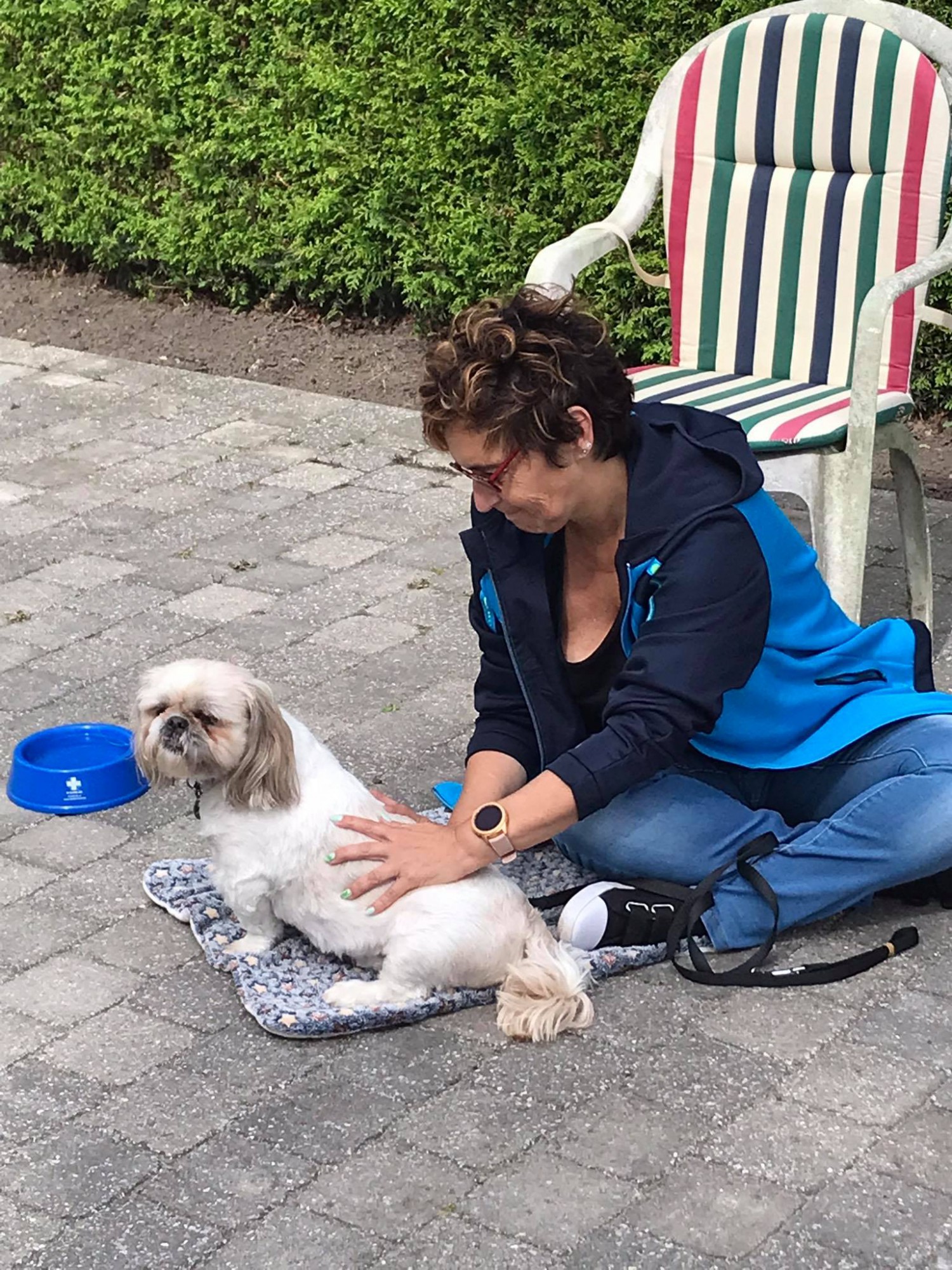 Vandaag stond de workshop ontspanningsmassage op het programma. Daarvoor had ik collega Linda van den Ekart uitgenodigd. Zij is naast kynologisch instructeur ook kynologisch masseur en Shiatsu specialist. De zes deelnemers hadden ieder hun eigen motivatie om mee te doen: van gewoon interessant tot gewrichtsproblemen bij de hond. Eigenlijk is er geen reden te verzinnen waarom je jouw hond geen ontspanningsmassage zou geven! Naast het fysieke doel, het losser en soepeler maken van spieren door een betere doorbloeding te creëren, worden honden ook mentaal meer ontspannen en neem je daardoor tevens fysieke spanningen weg. Spanningen door pijn, spanning door bepaalde ervaringen tijdens een wandeling, door vuurwerk of onweer. Bijkomend voordeel is dat je door massage een (nog) betere band met je hond creëert!